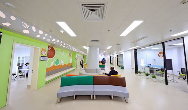 五緣院區(qū)重點(diǎn)開(kāi)設(shè)白內(nèi)障、青光眼、眼外傷、眼整形、眼底病、視光、斜視與小兒眼科、眼表及角膜病、高度近視等臨床科室,細(xì)分涵蓋了眼科中幾乎所有門(mén)類(lèi)。科室分區(qū)依照關(guān)聯(lián)度排列,相關(guān)性高的科室臨近設(shè)置,以方便患者就診。病區(qū)以溫和明快的暖綠及暖黃為主色調(diào),巧用配色以區(qū)分不同的功能模塊,烘托醫(yī)院溫馨氣氛。病區(qū)設(shè)置階梯型前臺(tái),坐在輪椅上也能與醫(yī)務(wù)人員無(wú)障礙溝通。吸聲材料打造走廊壁,以此減少噪音對(duì)病患的干擾。五緣院區(qū)還設(shè)計(jì)了適合不同年齡層次的休息區(qū),如休閑吧、兒童游樂(lè)區(qū)等,稀釋醫(yī)院診所的氛圍,緩解診療時(shí)帶來(lái)的陌生感和緊張感。
