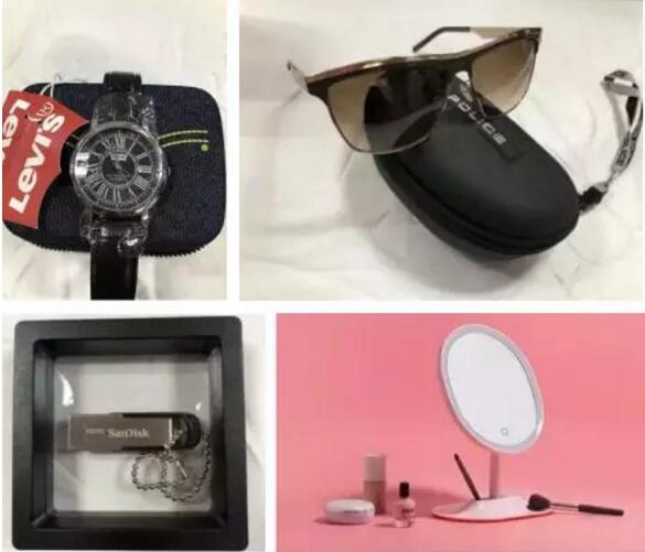 價值1980元的警察太陽鏡、價值598元的豪華鍋具、價值798元的暴龍?zhí)栫R、價值680元的李維斯手表、價值398元的艾尼雅太陽鏡和川久保玲太陽鏡、價值188元的魔法化妝鏡、價值168元護(hù)眼臺燈、價值150元U盤、價值108元進(jìn)口高檔毛巾……