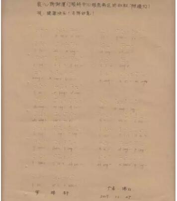 近日,廈門眼科中心眼底二病區(qū)的醫(yī)生護士們收到了一封特殊的感謝信。感謝信上每個醫(yī)生護士的名字,都是用盲文打出來的,下排還用鉛筆標注了拼音,仔細拼讀才知道這是一列醫(yī)生名單:黎曉新、吳國基...