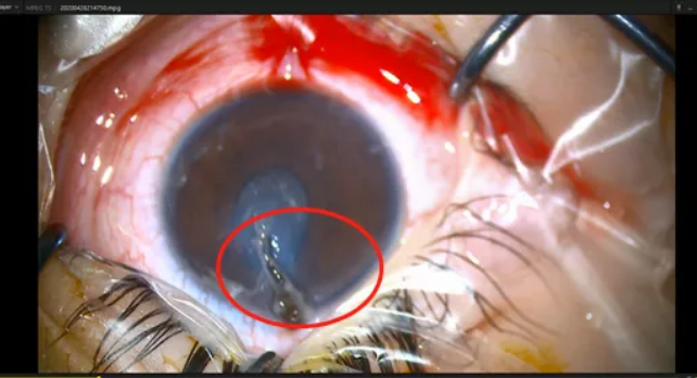 右眼被竹簽戳傷導(dǎo)致角膜穿通傷,右眼已2天不能睜眼,這意味著要立馬進(jìn)行右眼角膜清創(chuàng)縫合手術(shù),否則患兒將有失明風(fēng)險(xiǎn)。在疫情的特殊時(shí)期,李海波博士緊急協(xié)調(diào)各方,開(kāi)通綠色通道,20:14患兒被送進(jìn)了負(fù)壓手術(shù)室,李海波博士為她進(jìn)行了全麻下角膜清創(chuàng)縫合手術(shù)。