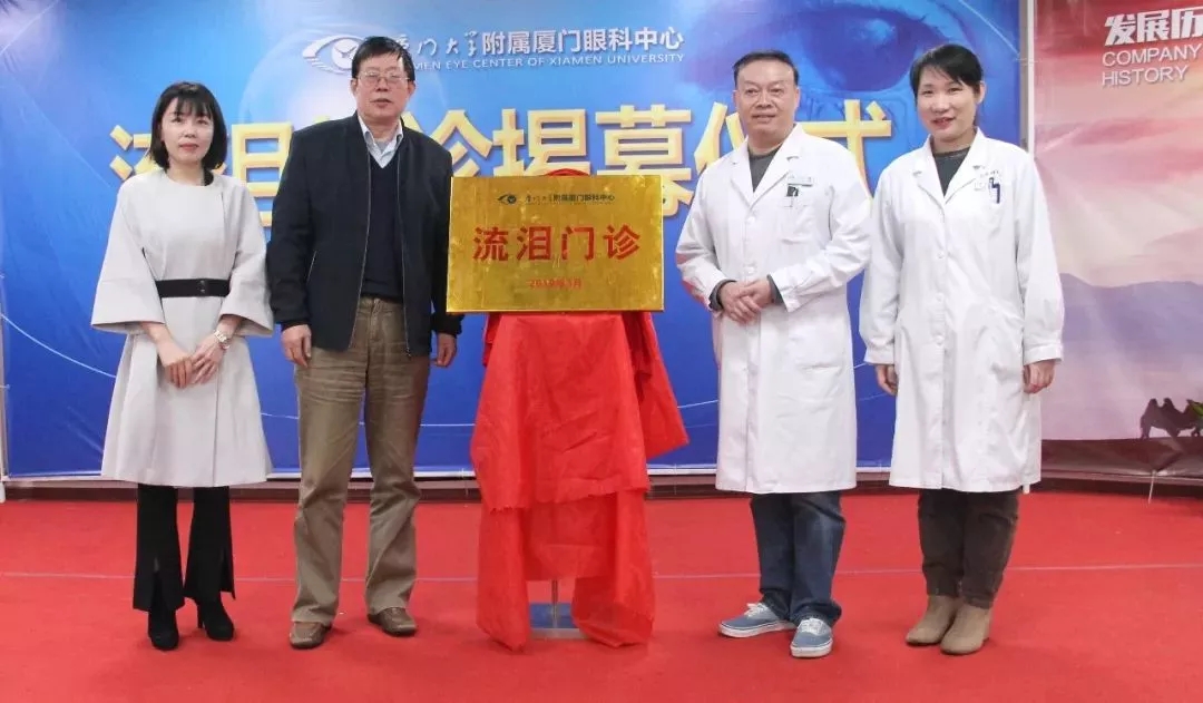 ▲廈門眼科中心業(yè)務(wù)院長侯家敏、眼整形??茖W科周太平主任、淚道疾病專家鄧坤明、執(zhí)行總經(jīng)理姚鄭玲玲等為流淚門診揭牌