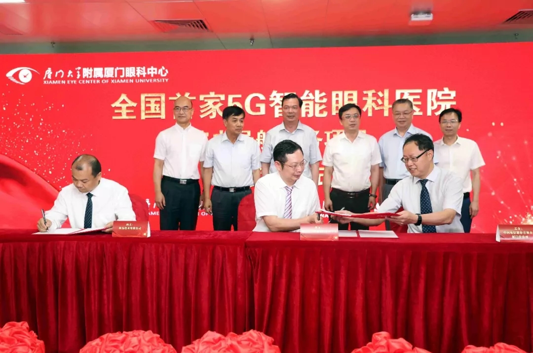 ▲廈門大學(xué)附屬廈門眼科中心董事長蘇慶燦與華為移動網(wǎng)絡(luò)數(shù)字化集成與運(yùn)營總經(jīng)理段學(xué)鵬、中國電信廈門分公司總經(jīng)理黎樹旺正式簽約“5G智能眼科醫(yī)院”