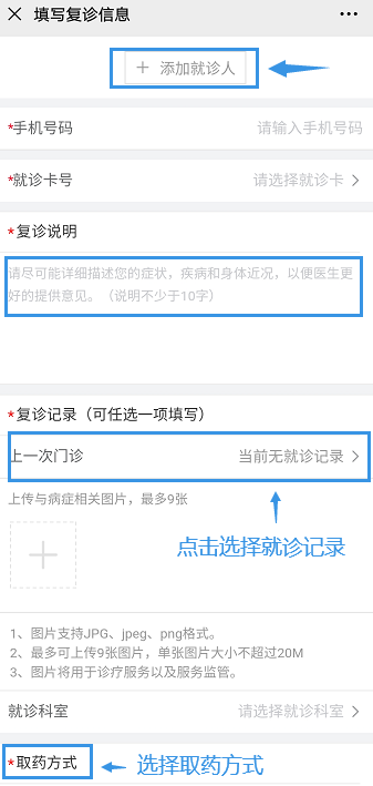填寫就診人信息、復(fù)診說明,對醫(yī)生詳細描述目前的癥狀;在復(fù)診記錄中,可以添加往期復(fù)診記錄,以便醫(yī)生快速了解病史