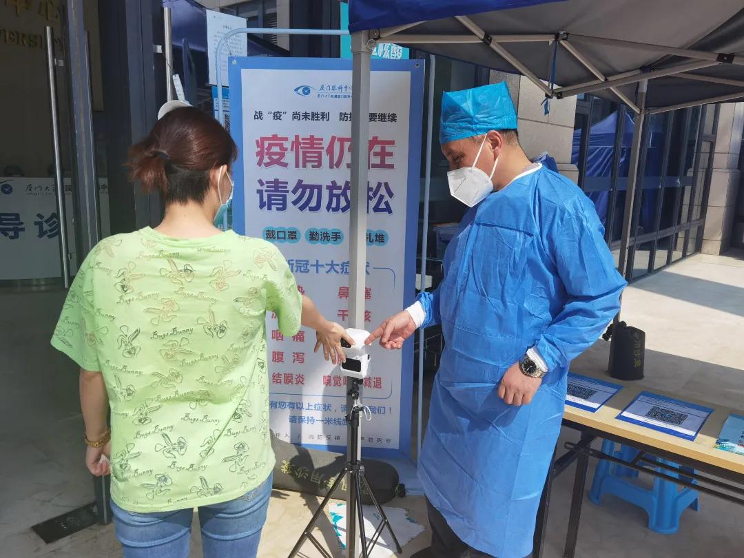 在廈門眼科中心預(yù)檢分診入口處,來院就診患者一一配合進(jìn)行嚴(yán)格的程序后方進(jìn)入門診區(qū)。