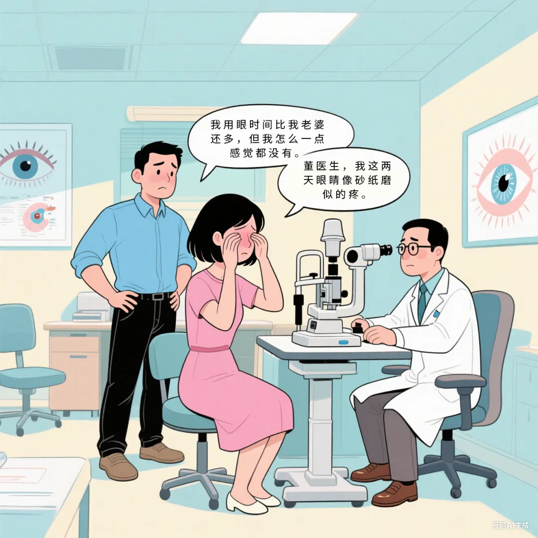 剛結(jié)束加班的設(shè)計師麗麗不停揉著發(fā)紅的眼睛:"董醫(yī)生,我這兩天眼睛像砂紙磨似的疼。"而陪她來的程序員丈夫阿強(qiáng)插話:"我用眼時間比我老婆還多,但我怎么一點(diǎn)感覺都沒有。"